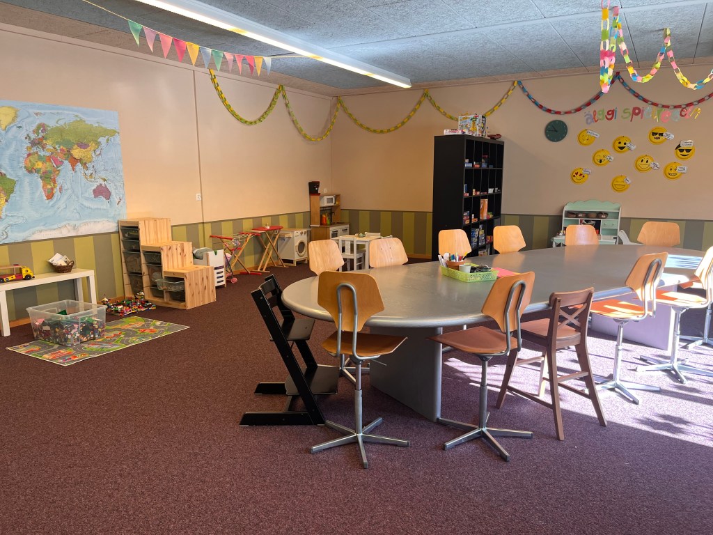 Lernbereich der schulergänzenden Tagesstruktur „Älggi“, mit grossem Tisch zum Basteln oder Hausaufgaben machen.